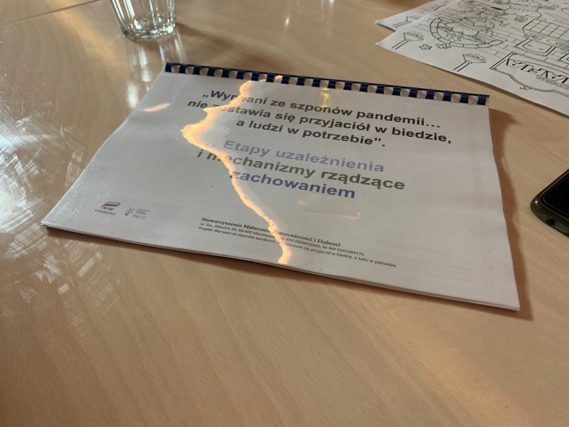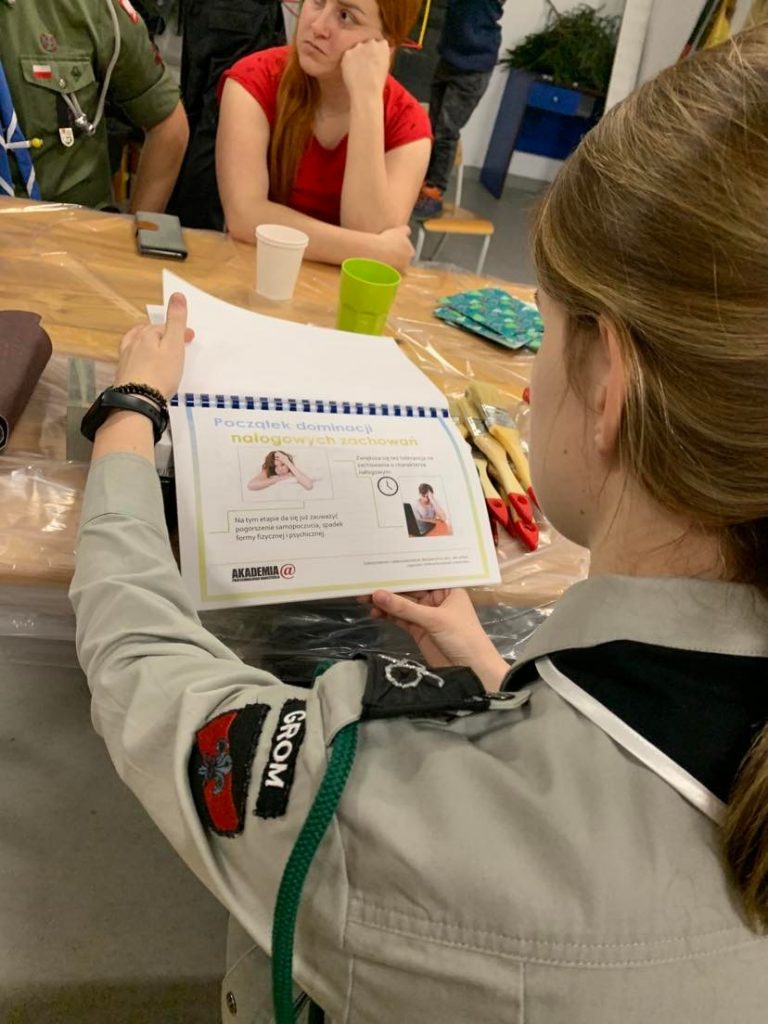 „Pomoc uzależnionym”. Celem warsztatów było wskazanie skutków jakie niesie za sobą nadmierne używanie telefonów czy komputerów. Uczestnicy szkolenia brali czynny udział podczas warsztatów, wymieniając skutków oraz wskazując czynności, które osoba uzależniona powinna wykonać, aby z takiego uzależnienia wyjść. Część uczestników przyznała się do uzależnienia i postanowiła bardziej kontrolować swój nałóg oraz więcej czasu poświęcać rodzinie czy znajomym.